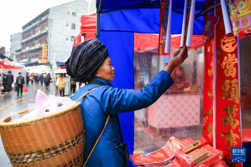 1月18日,顧客在湖南省鳳凰縣山江鎮集市上選購春聯。