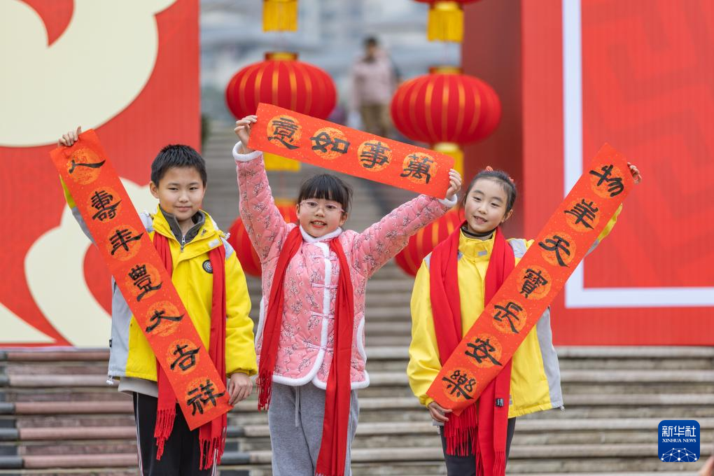 1月18日,重慶市永川區舉辦“書香永川·墨香萬家”為主題的新春送萬福進萬家活動,組織當地書法家、民間文藝家及部分學校師生現場書寫春聯、寫福字、做剪紙,并將其免費贈送給廣大市民。這是小朋友展示領取的春聯。