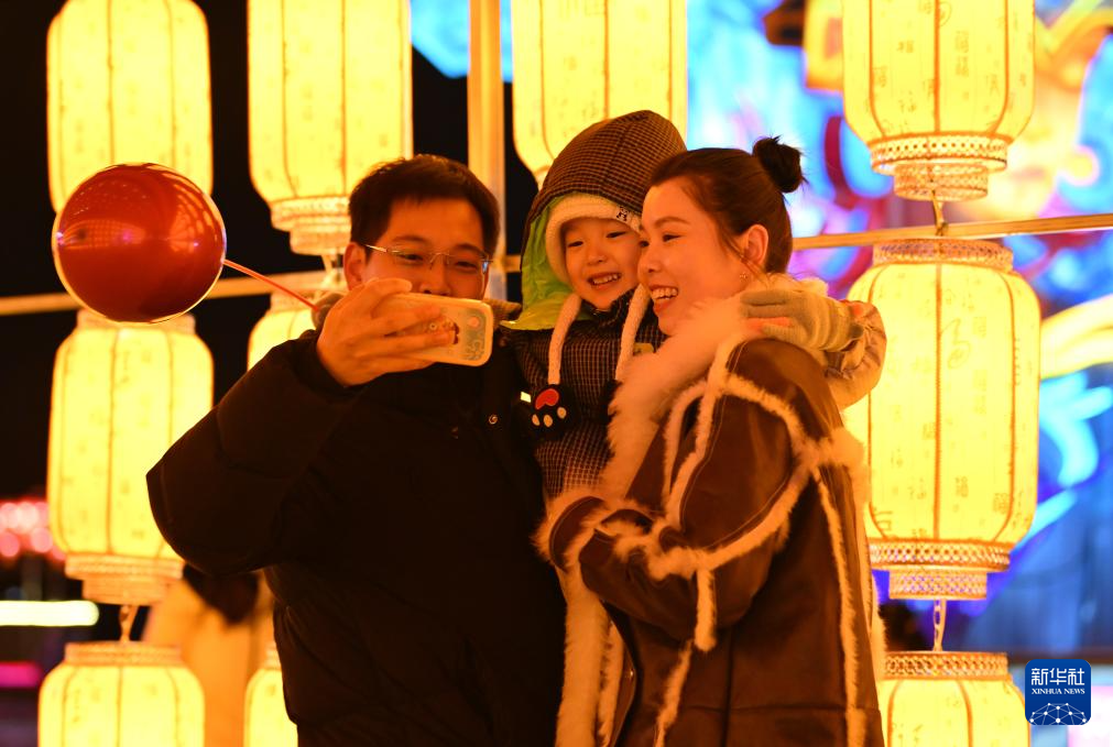 1月18日,天津市西青區楊柳青國潮燈展亮燈儀式在楊柳青鎮舉行。這是游人在燈展現場拍照留影。