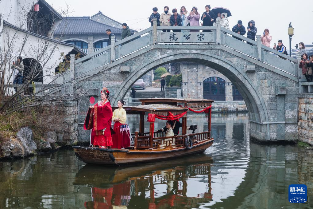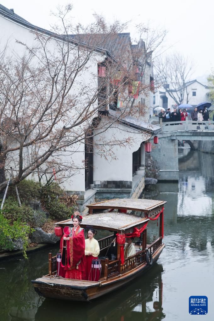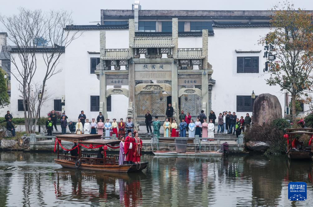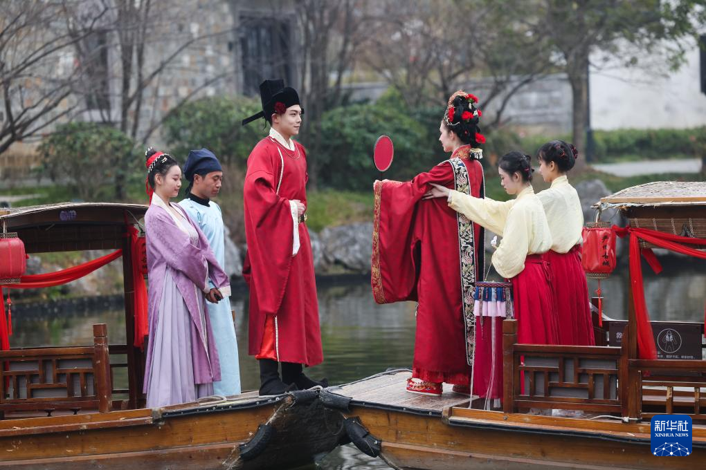 1月18日,中外青年身著傳統服飾在建德嚴州古城的船上體驗傳統水上婚禮習俗,包括出閣、梳妝、登船、親迎、禮拜等多個環節。