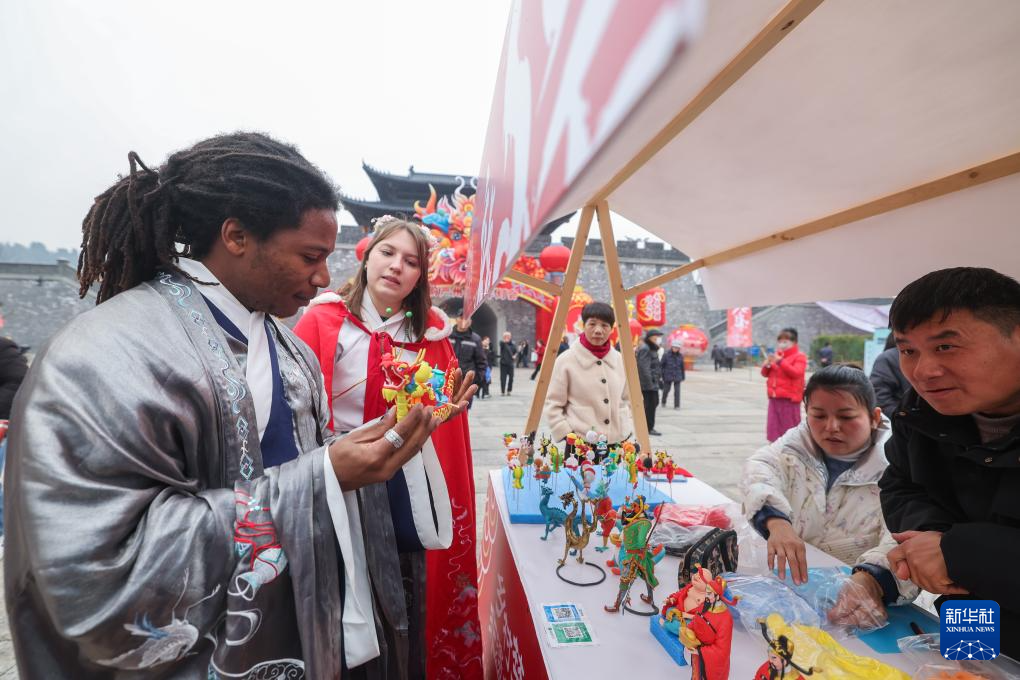 1月18日,中外青年身著傳統服飾在建德嚴州古城宋韻集市上觀看傳統米塑工藝品。