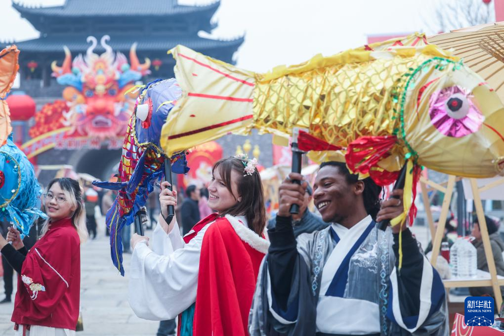 1月18日,中外青年身著傳統服飾在建德嚴州古城宋韻集市上體驗傳統魚燈。