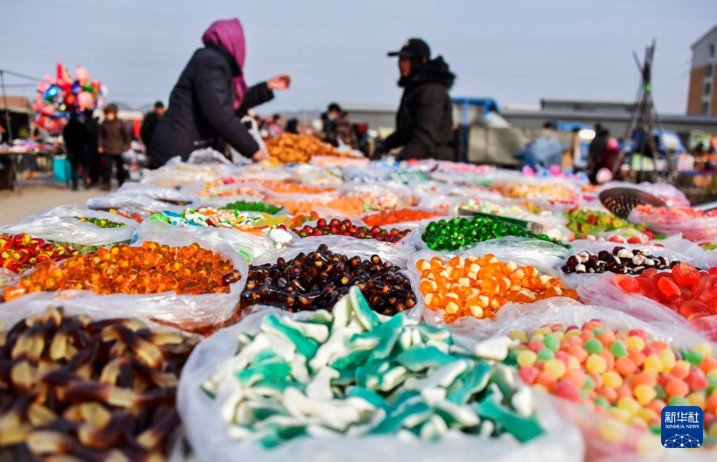 1月19日,人們在河北省遵化市平安城大集上選購糖果。