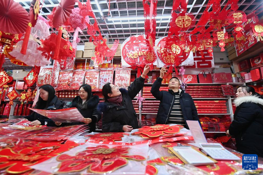 1月19日,人們在河南省開封市年貨批發市場選購春節飾品。