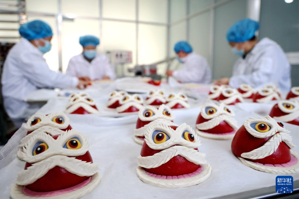 1月22日,在山東省濱州市陽信縣洋湖鄉一家花饃生產企業車間,工人加緊趕制“醒獅龍”花饃供應年貨市場。