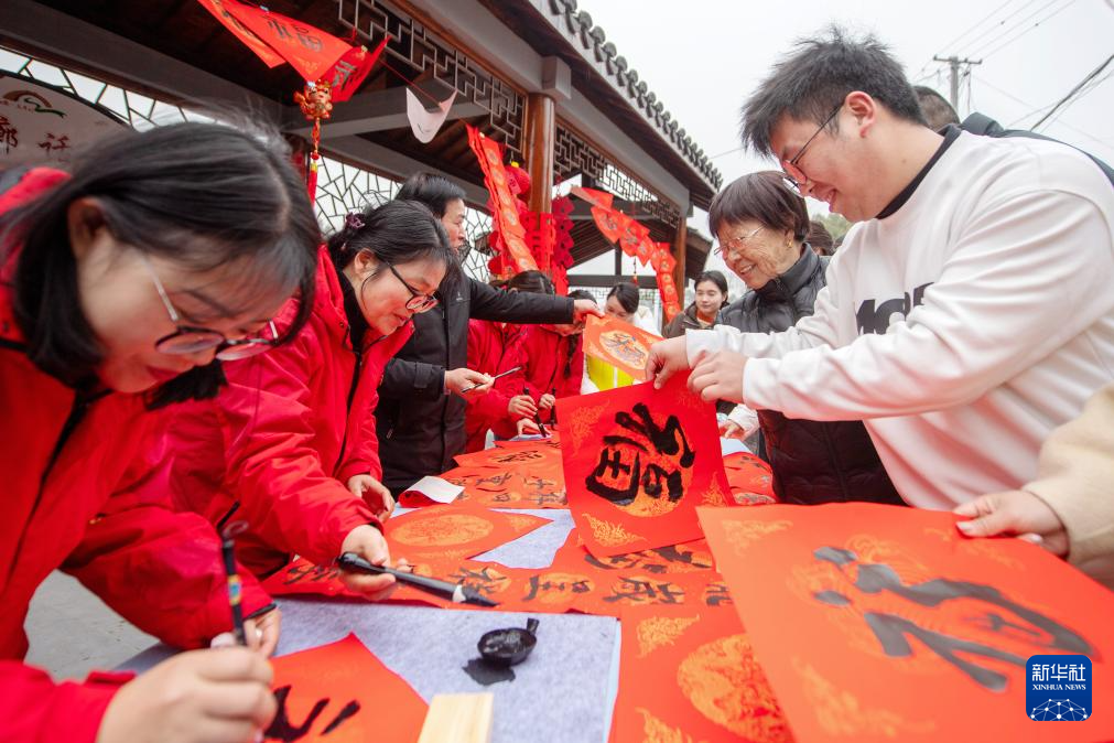 1月22日,在浙江省湖州市長興縣泗安鎮太平村文化禮堂外,村民領取“濃濃墨香情,福進千萬家”迎新送?;顒又驹刚邥鴮懙母W?。