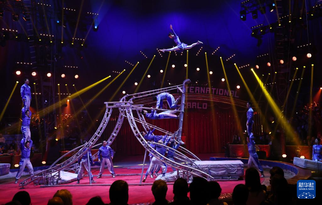 1月19日,中國武漢雜技團演員在摩納哥蒙特卡洛表演節目《揚帆追夢·浪船》。