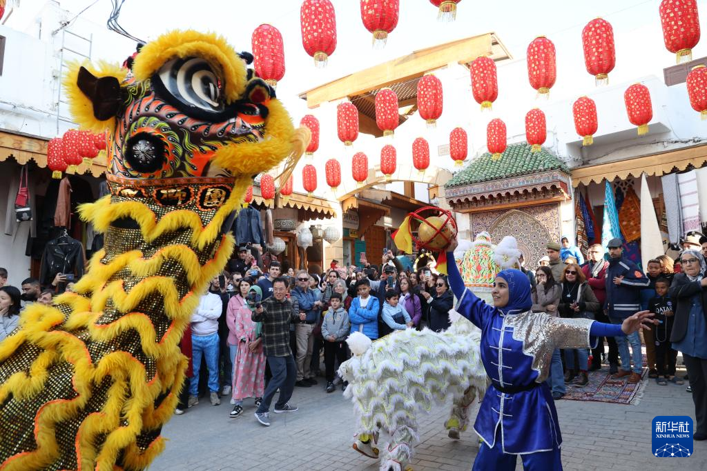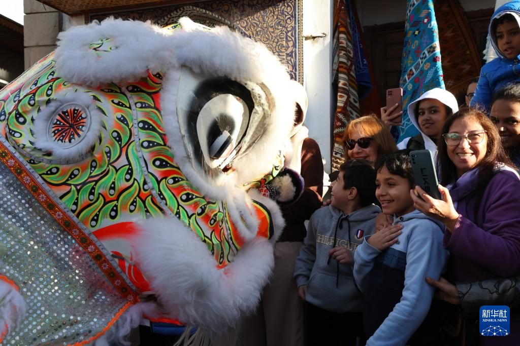 1月22日,人們在摩洛哥首都拉巴特老城里觀看舞獅表演。