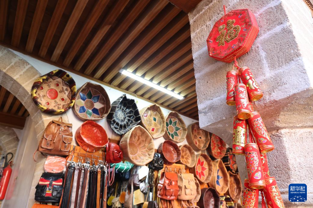 1月22日,在摩洛哥首都拉巴特,中國農歷春節裝飾品和摩洛哥傳統皮制手工藝品被掛在墻上。