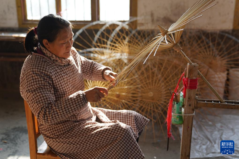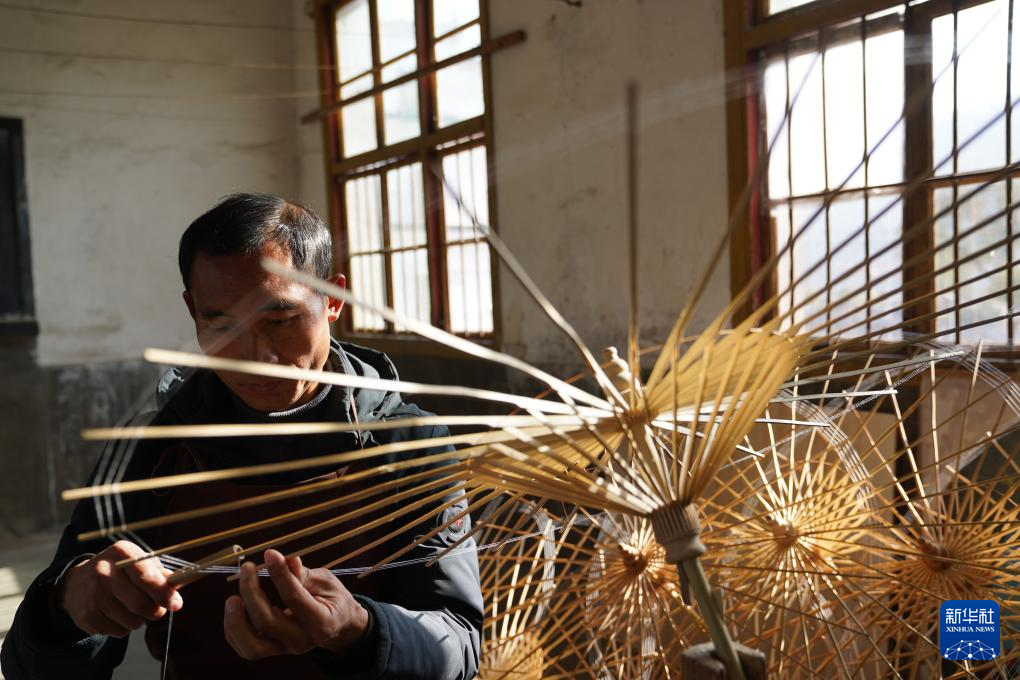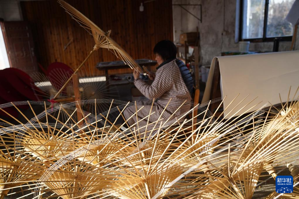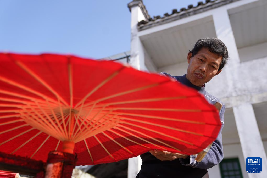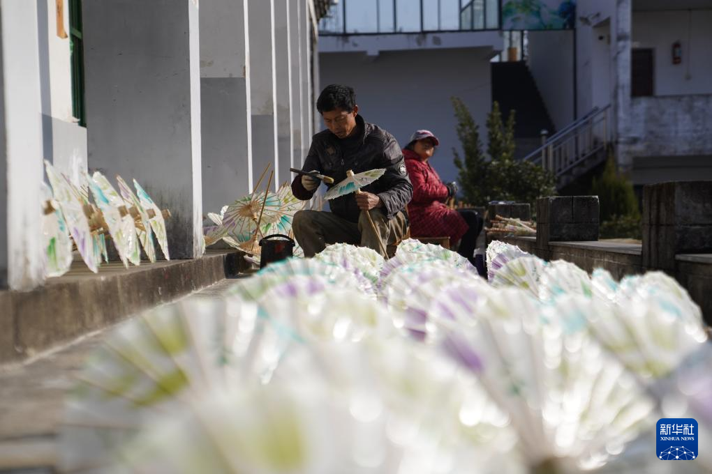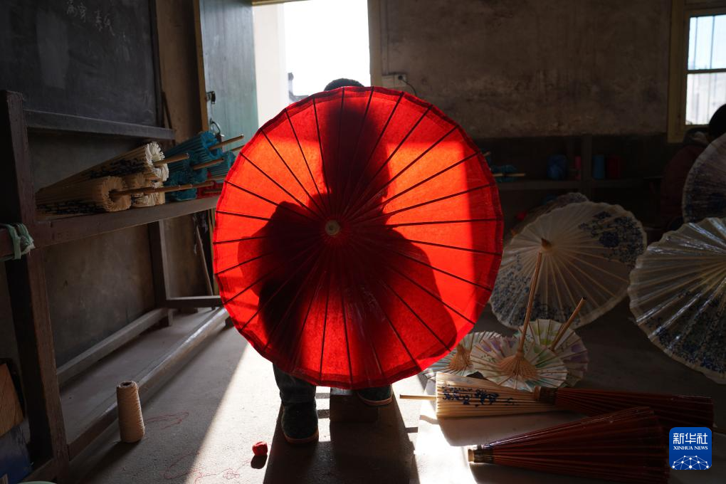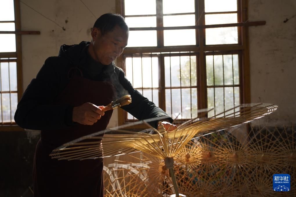 江西省婺源縣賦春鎮甲路村的工匠在甲路紙傘的傘骨上刷漿糊(1月11日攝)。