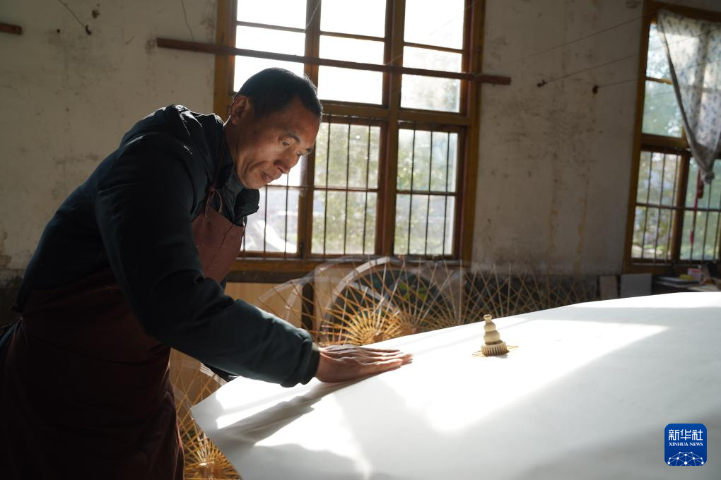 江西省婺源縣賦春鎮甲路村的工匠在制作甲路紙傘的傘面(1月11日攝)。
