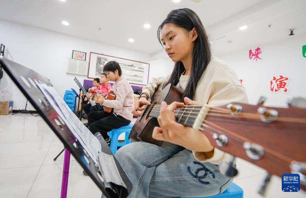 1月23日,學生在河北省遵化市一家培訓機構學習彈奏吉他。