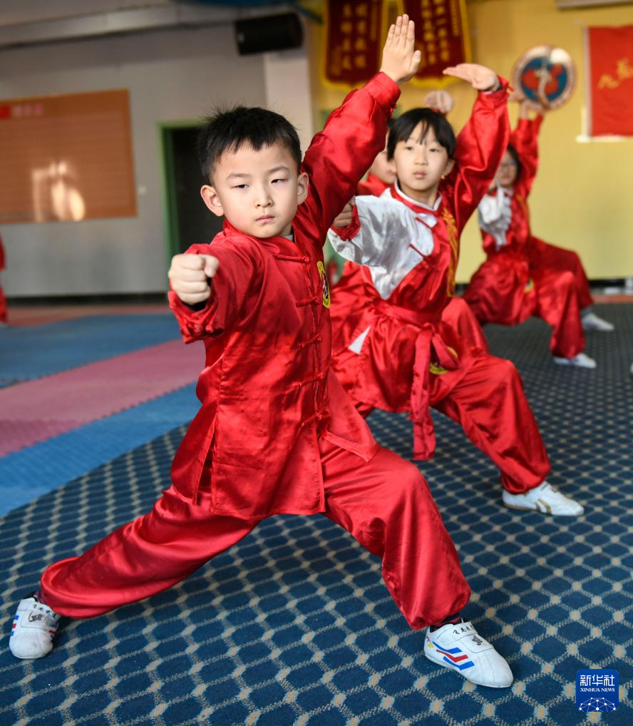 1月23日,學生在河北省遵化市一家培訓機構練習武術動作。