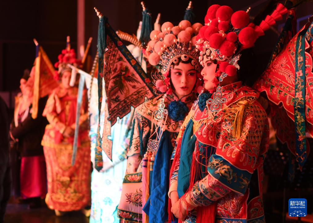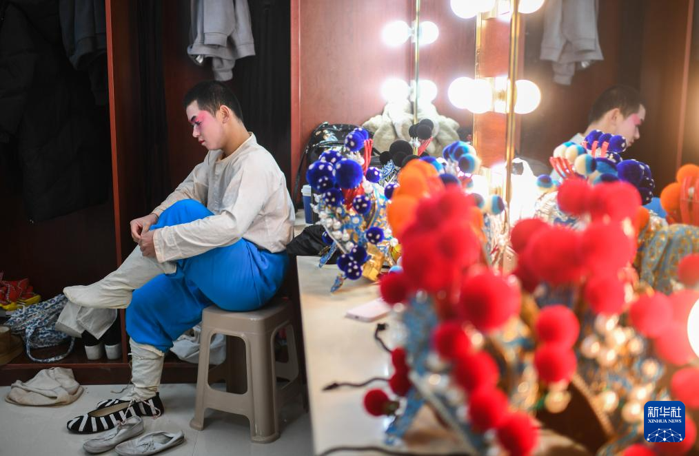 1月23日,漢劇演員鄭椏文(右)在后臺等待登臺演出。
