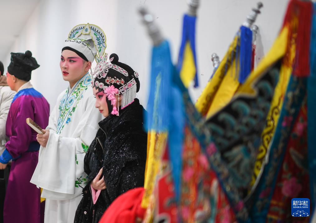 1月23日,黃梅戲演員吳佩佩(左)與王謙在臺邊候場。