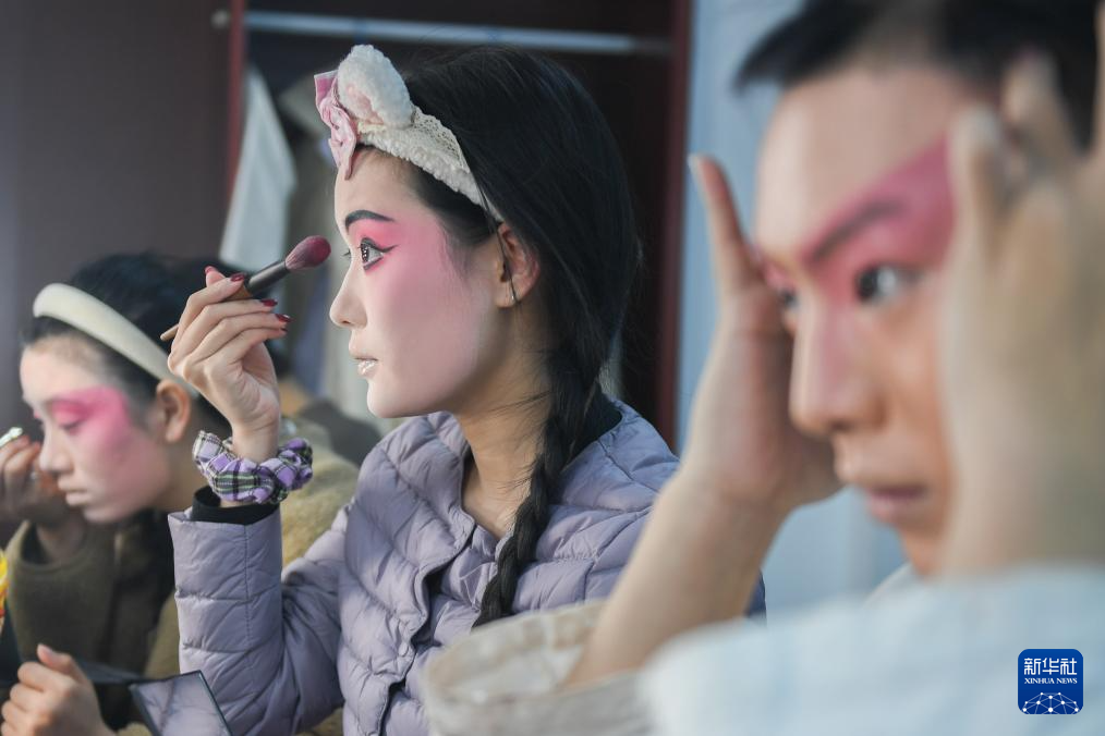 1月23日,漢劇演員湯安琪(中)在登臺演出前化妝。