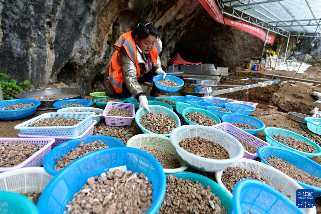 1月24日,在貴州普定穿洞遺址,考古工作者在整理篩出遺物。