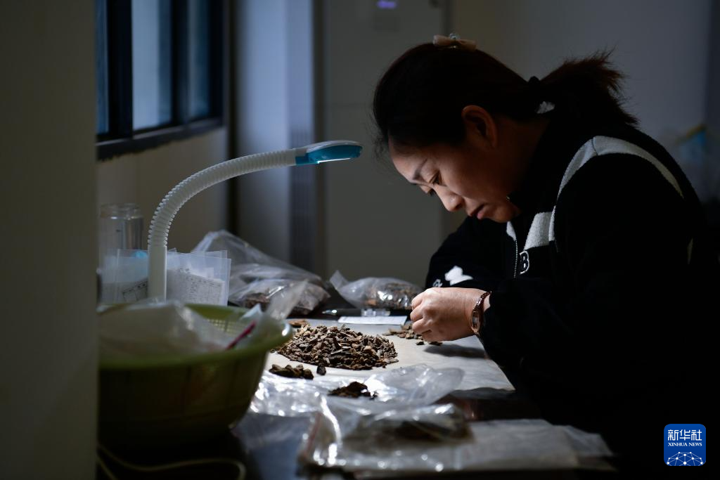 1月24日,在貴州省文物考古研究所穿洞工作站,考古工作人員對篩出遺物進行分選。