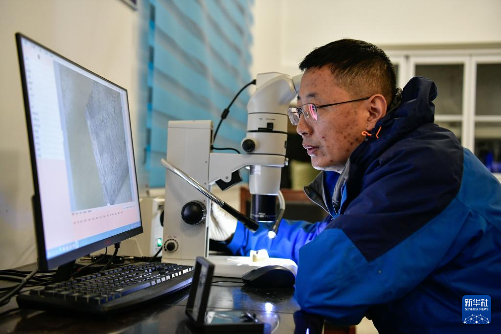 1月24日,在貴州省文物考古研究所穿洞工作站,貴州省文物考古研究所副所長張興龍在使用顯微鏡觀察穿洞遺址出土的考古標本。