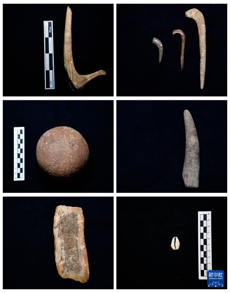 拼版照片:這是在貴州省文物考古研究所穿洞工作站拍攝的穿洞遺址出土的骨角制品和石制品等考古標本(1月24日攝)。