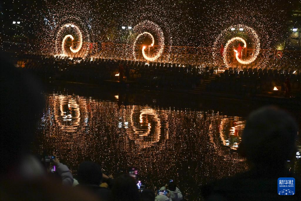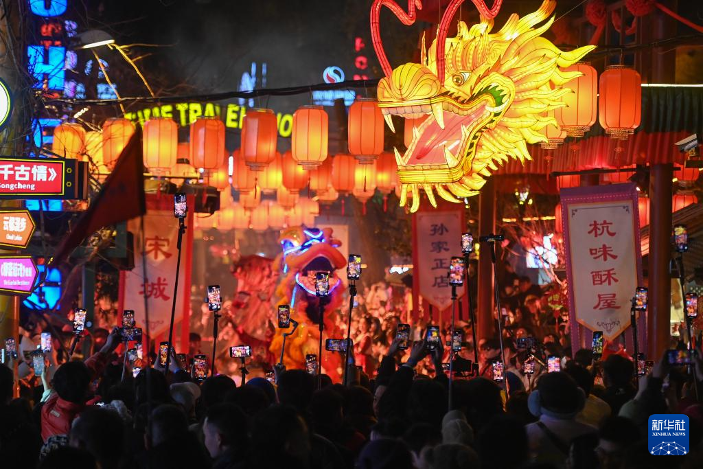 當日,浙江杭州宋城景區新春主題活動“狂歡中國年”啟幕,游園會、舞龍醒獅、打鐵花等演出活動亮相,為游客營造濃郁的中國年氛圍。