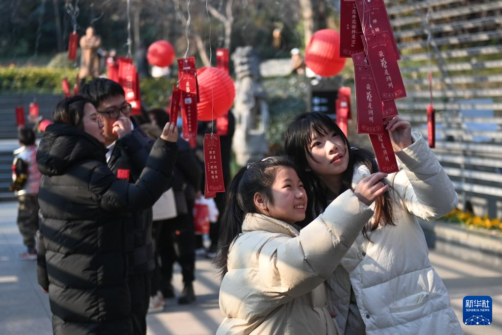 1月28日,市民在吳興區愛山街道愛山廣場猜燈謎。