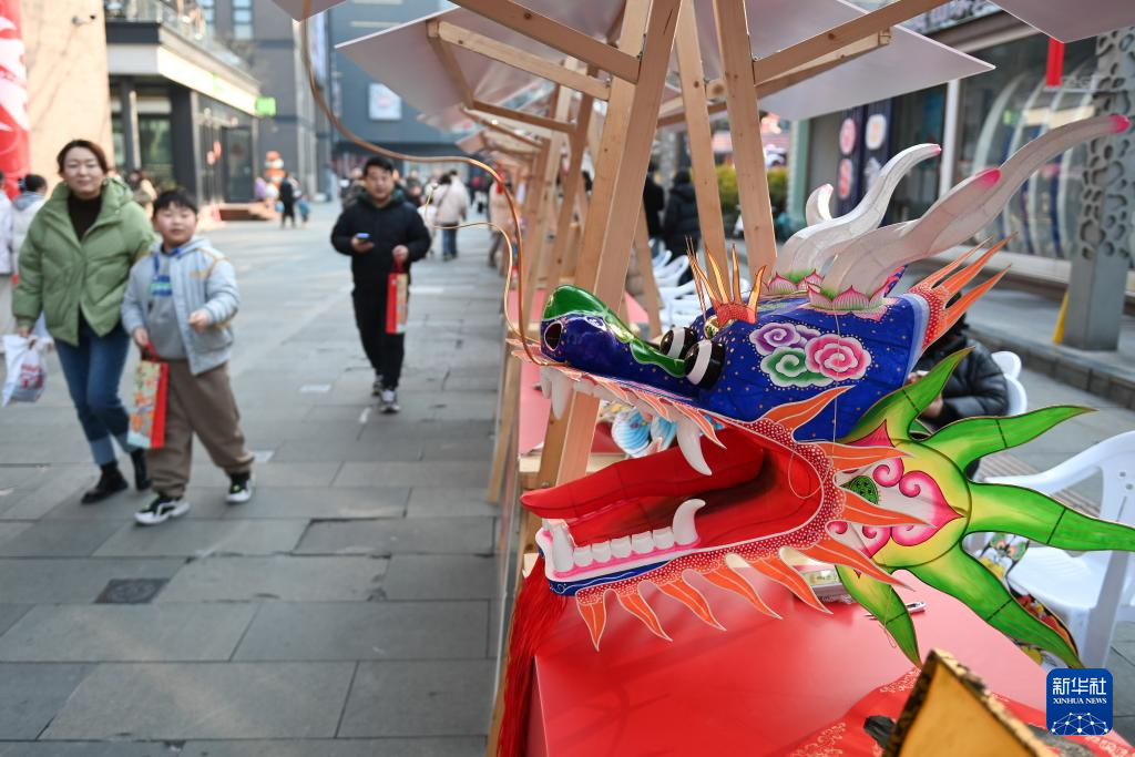 1月28日,市民在吳興區愛山街道愛山廣場的文藝市集上觀看“龍頭”造型風箏。