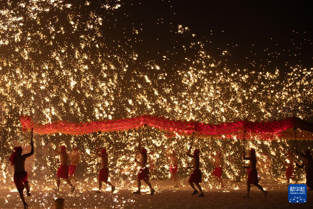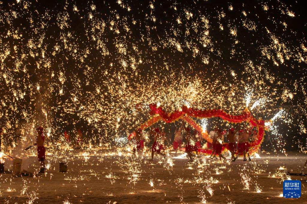 1月29日,在哈爾濱伏爾加莊園,銅梁火龍隊的隊員表演銅梁龍舞。