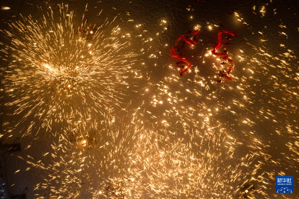 1月29日,在哈爾濱伏爾加莊園,銅梁火龍隊的隊員表演銅梁龍舞(無人機照片)。