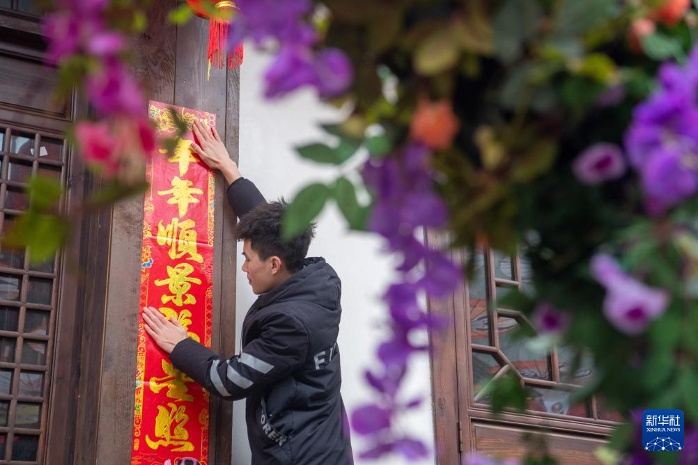 1月30日,雍溪古鎮居民在老屋門前張貼春聯。