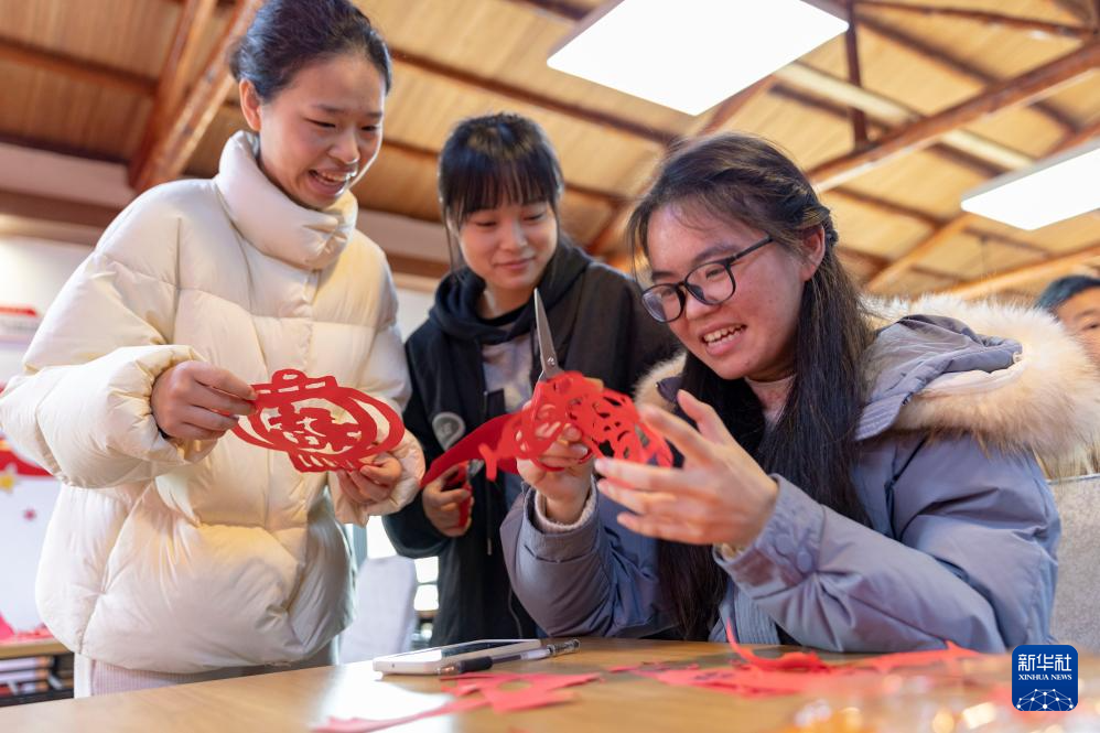1月31日,在江西省廬山市華林鎮黨群服務中心內,人們一起剪窗花。