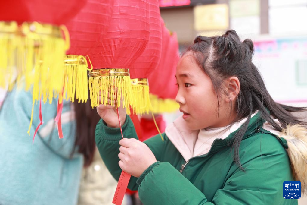 1月31日,在貴州省黔東南苗族侗族自治州岑鞏縣?水街道,小朋友在迎新春活動中參與猜燈謎。