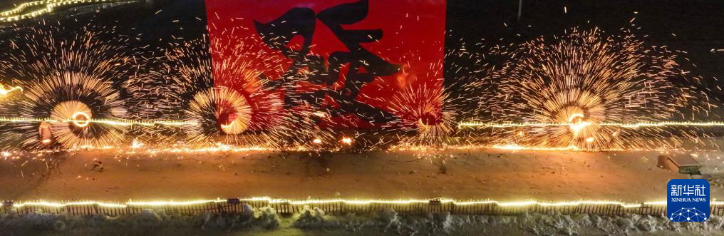 1月31日,民間藝人在河北省遵化市迎新春冰雪節上表演打鐵花民俗節目(無人機照片)。