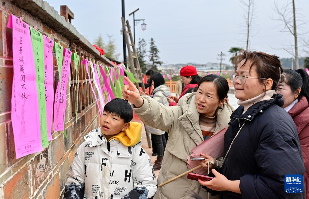 1月31日,在中國歷史文化名村、江西省撫州市金溪縣雙塘鎮竹橋村,游客饒有興致地參加景區舉辦的迎新春猜謎趣味比賽。
