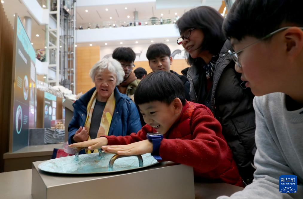 1月31日,小朋友在展覽上體驗青銅“龍洗”的共振效果。