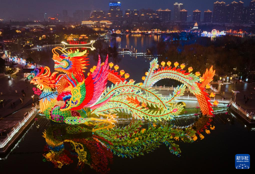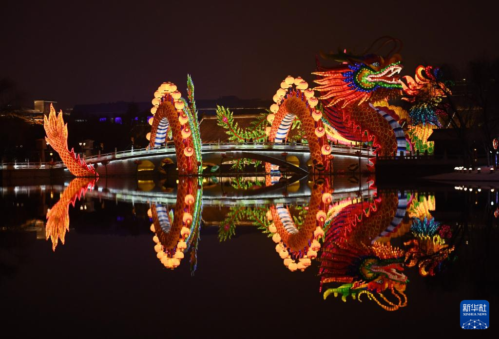 2月2日,龍形花燈在西安大唐芙蓉園點亮。