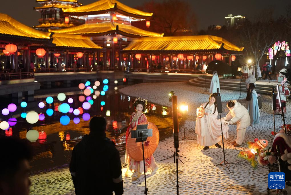 2月2日,游客在西安大唐芙蓉園內拍照游玩。