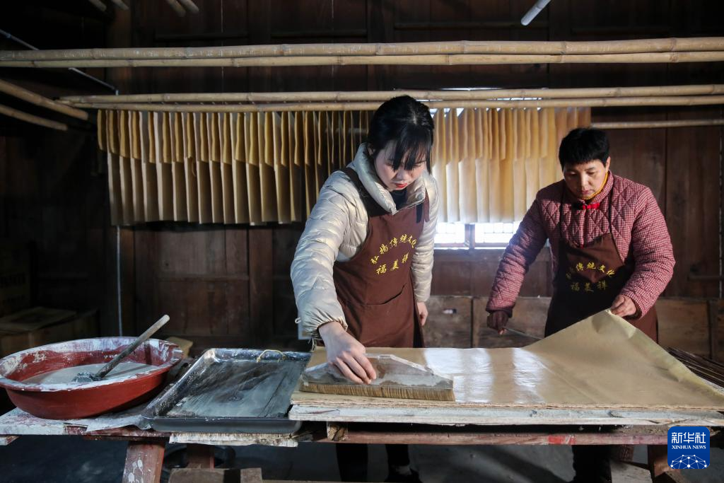 1月25日,在灘頭鎮福美祥年畫作坊,年畫藝人在加工印制年畫的紙張。