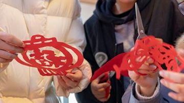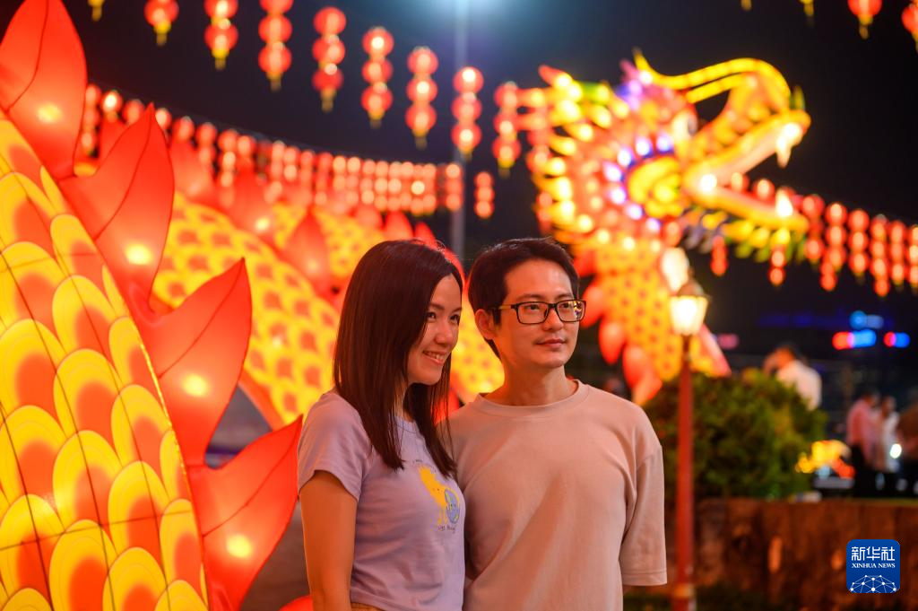 2月3日,馬來西亞吉隆坡天后宮,游客與龍形彩燈裝置合影。
