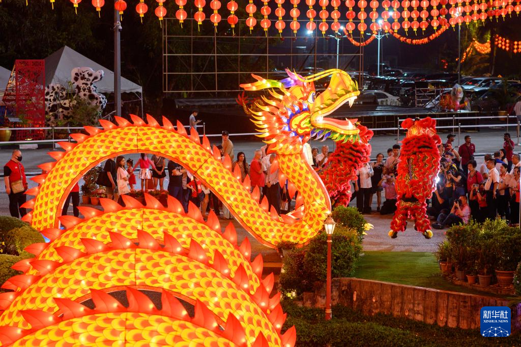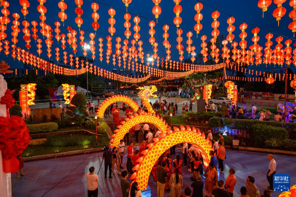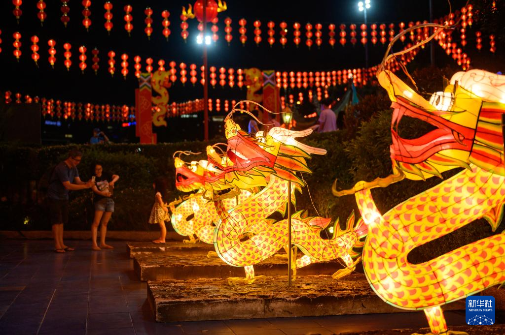 吉隆坡天后宮點亮以龍為主題的彩燈裝置迎接龍年的到來。