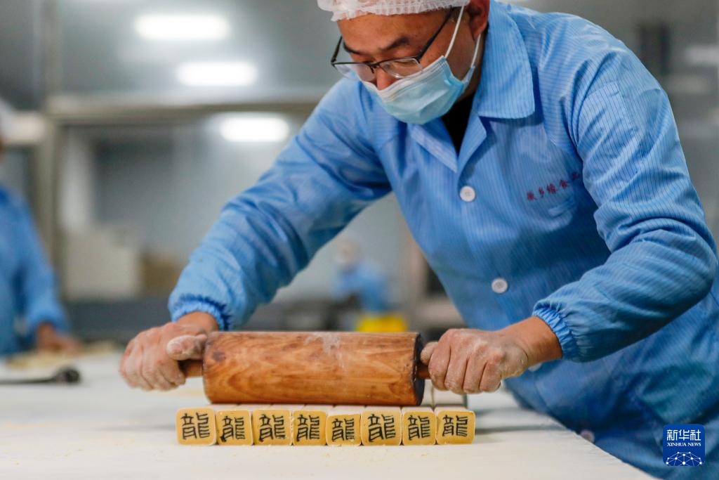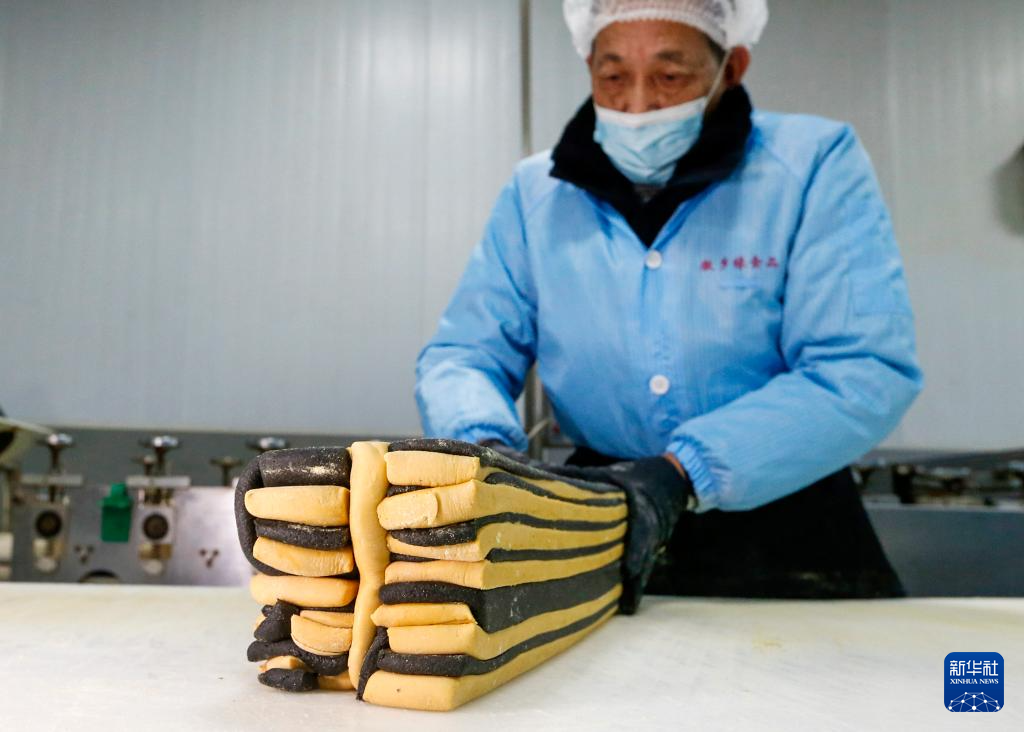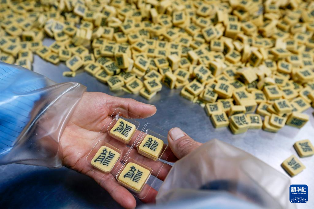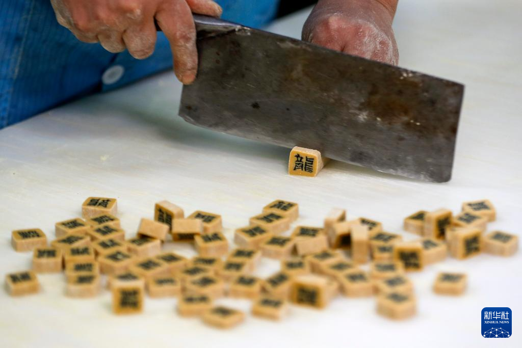 新春佳節將至,在安徽省黃山市祁門縣,嵌字豆糖非遺傳承人經過熬糖、磨粉、攪拌、壓實、制字、拉伸、切片等手工工序制作嵌字豆糖。嵌字豆糖在切開的每塊糖片中,都會蘊藏著一個吉祥如意的漢字,是一種可食可賞的特色糕點。
