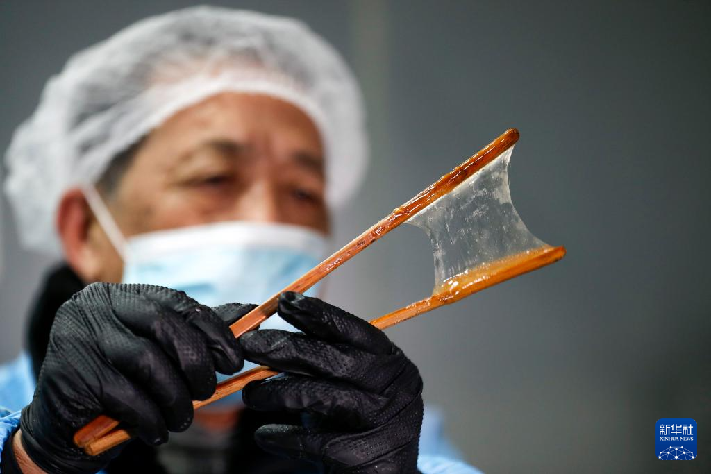 1月31日,非遺傳承人金惠民在觀察麥芽糖稀的粘稠度。
