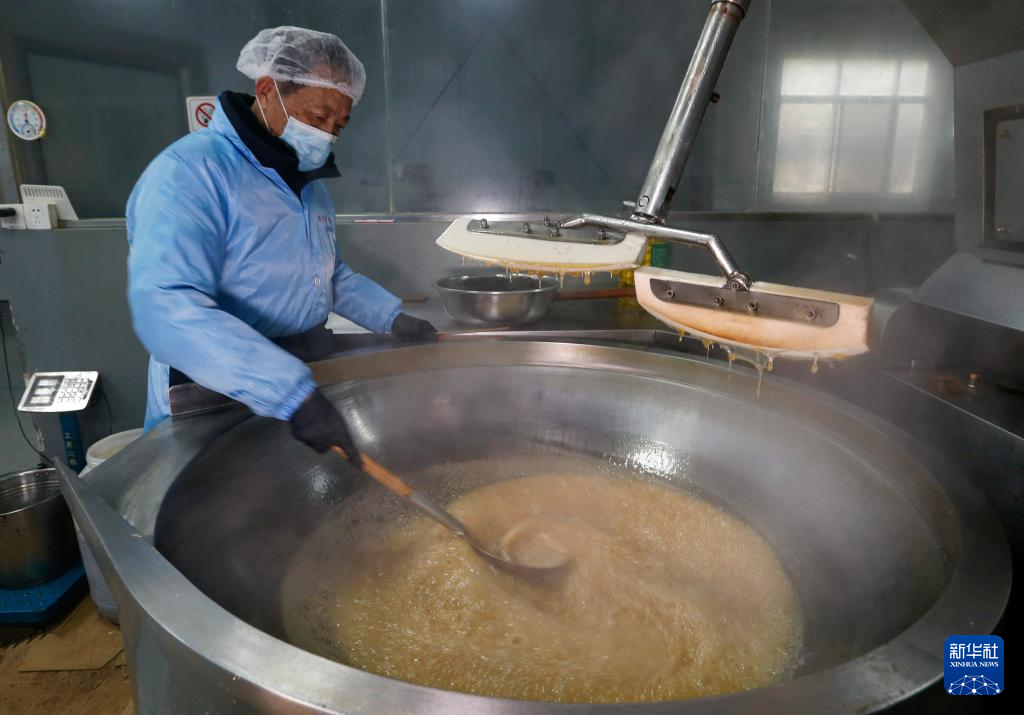 1月31日,非遺傳承人金惠民在熬制麥芽糖漿。