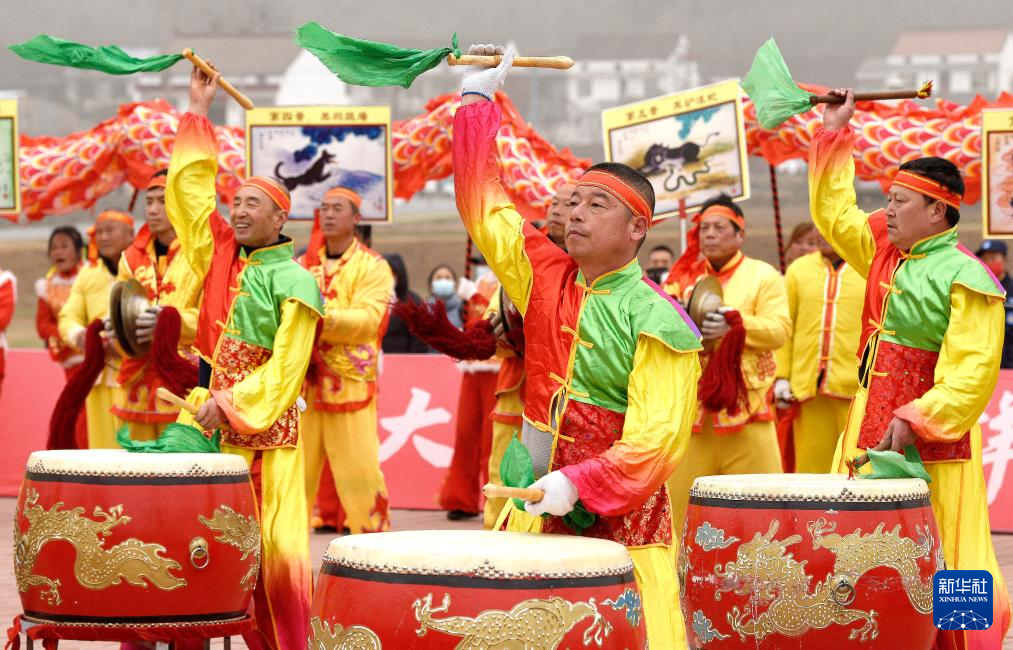 西安市鄠邑區甘亭街道的群眾在蔡家坡終南劇場進行鼓舞表演(2月18日攝,無人機照片)。