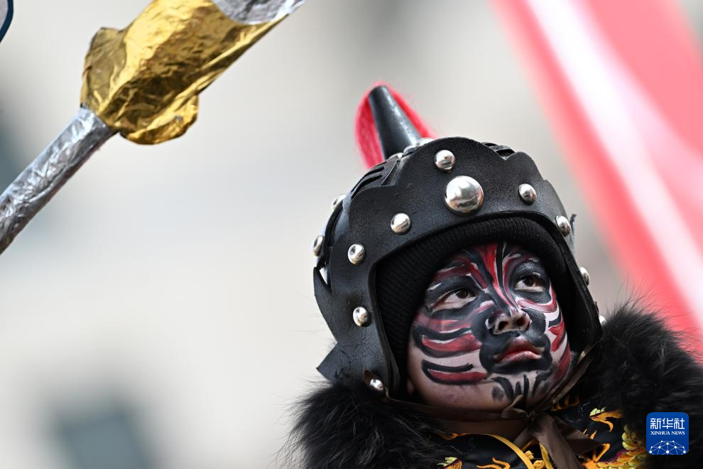 2月19日,在青海省西寧市,小演員在社火巡游活動中表演。