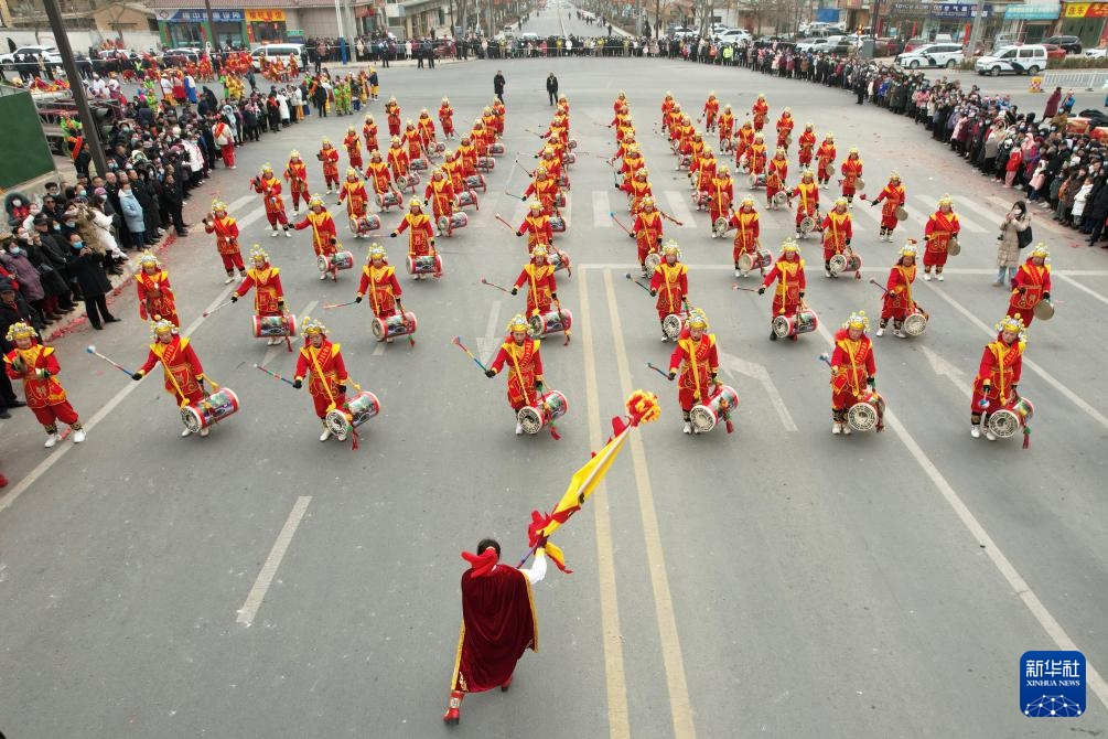 2月20日,在榆中縣城關鎮,興隆山村社火隊在表演太平鼓(無人機照片)。