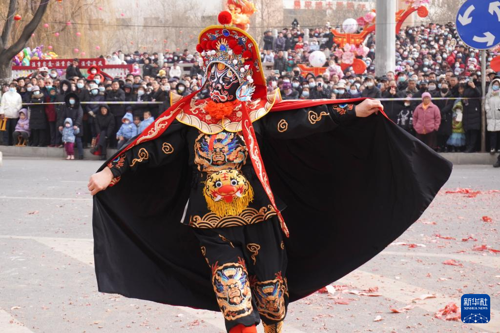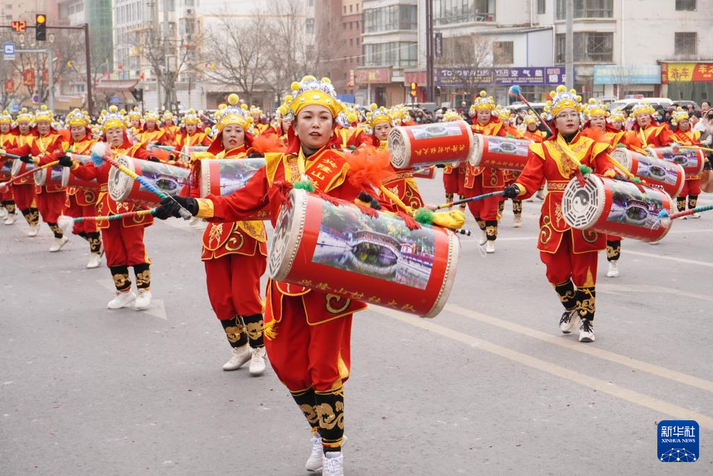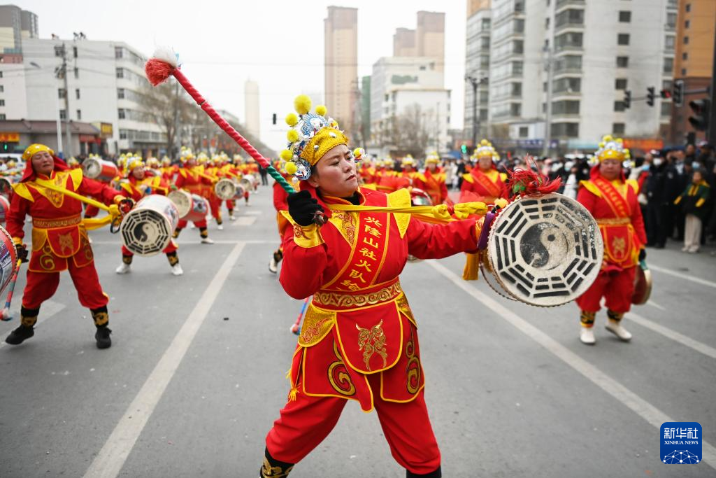 2月20日,在榆中縣城關鎮,興隆山村社火隊在表演太平鼓。