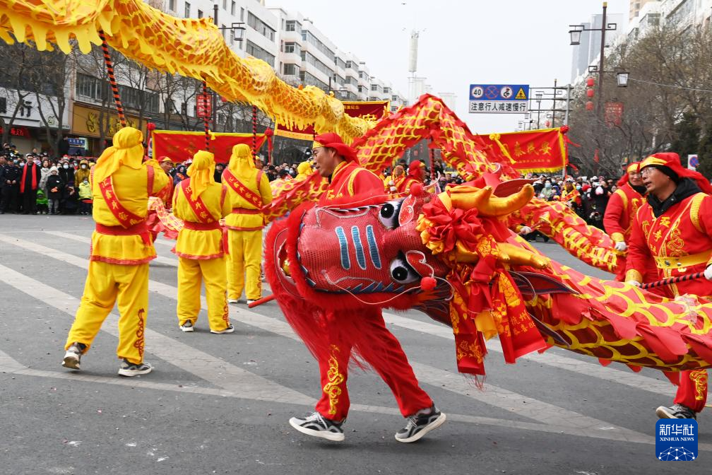 當日是農歷正月十一,在甘肅省蘭州市榆中縣,多個農村社火隊在縣城進行展演,舞龍舞獅,熱鬧非凡。