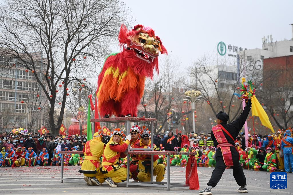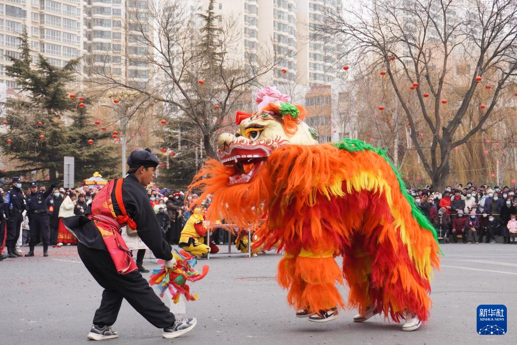 2月20日,在榆中縣中心廣場,紅寺村社火隊在表演舞獅。