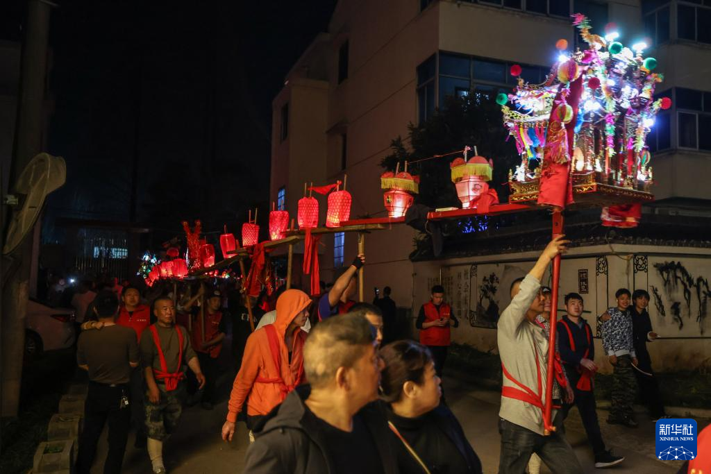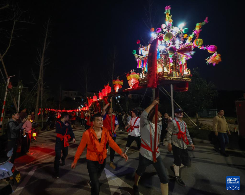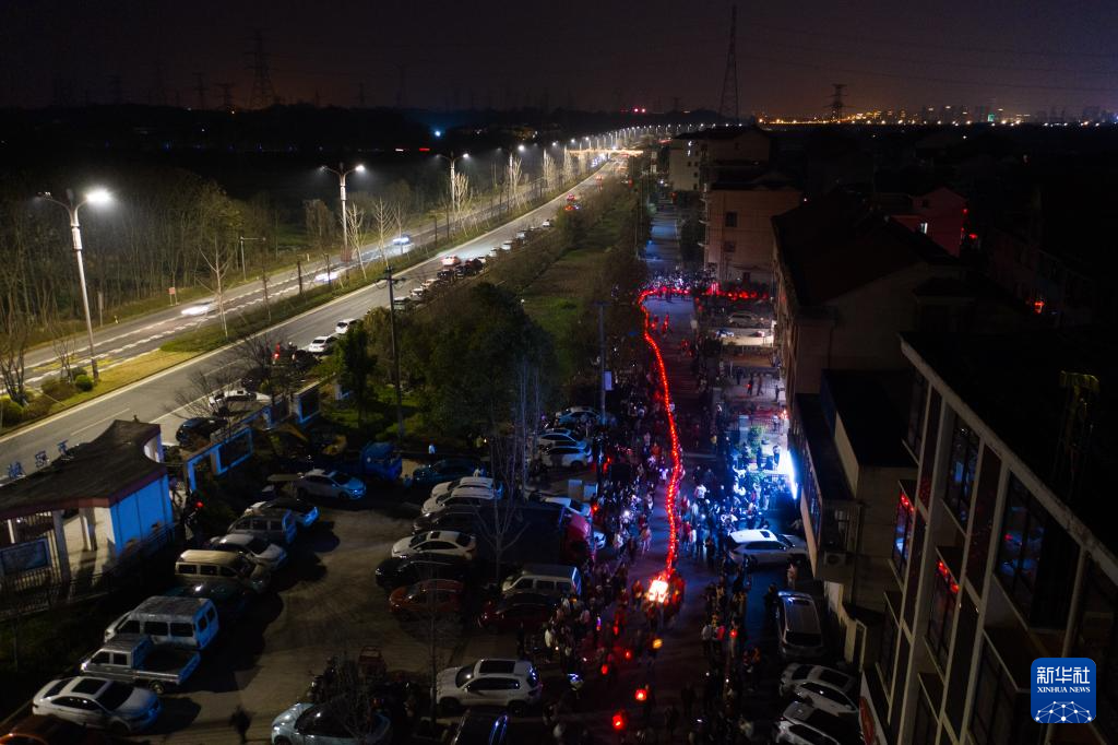 2月19日,在澧浦鎮里新村,村民們抬著長長的傳統板凳龍在村落中穿行。
